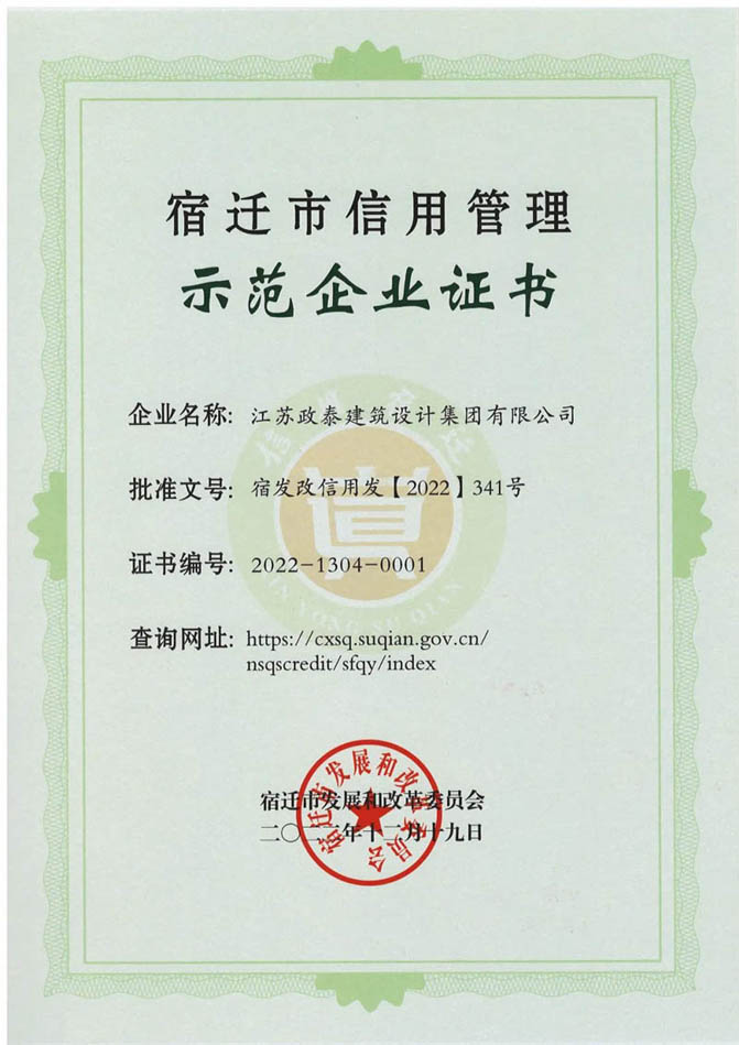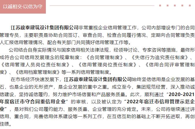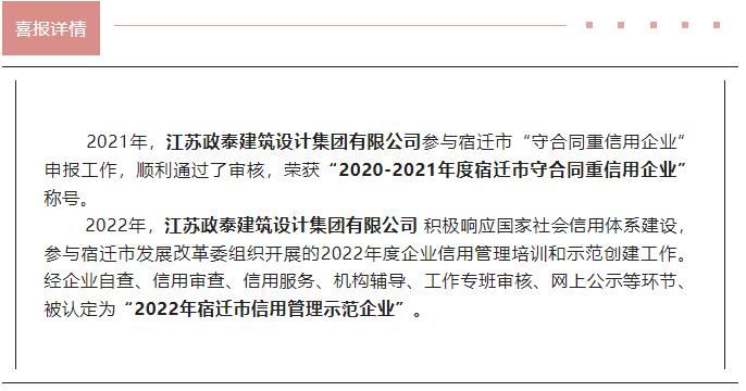 喜报丨政泰设计集团荣获“2022年宿迁市信用管理示范企业”称号、“2020—2021年度宿迁市守合同重信用企业”称号